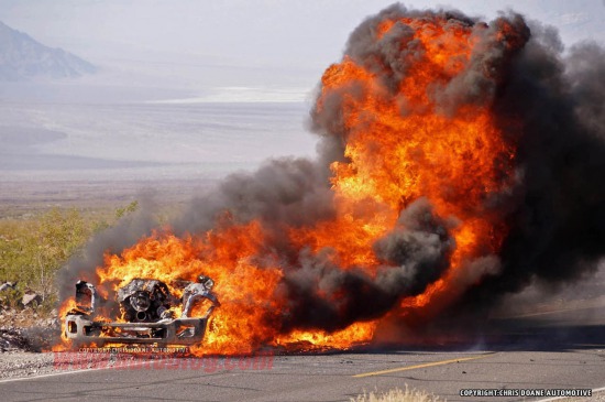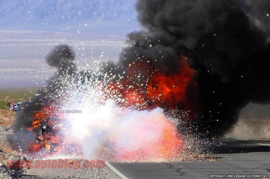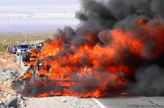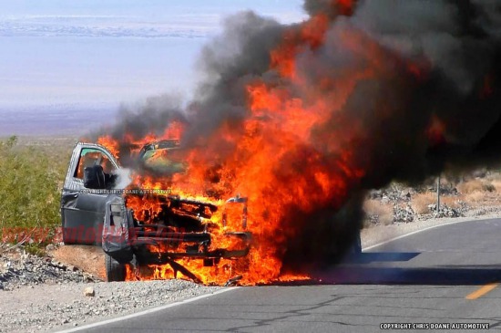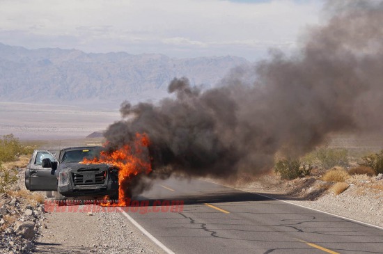 炎炎夏日,死亡谷的氣溫曾經(jīng)創(chuàng)下過57攝氏度的世界紀錄,估計今天也不例外。也許是福特想測試這輛SuperDuty的極限耐受工作溫度,所以選擇了這個地方。不過這次看起來福特的測試失敗了,因為這車著火了。