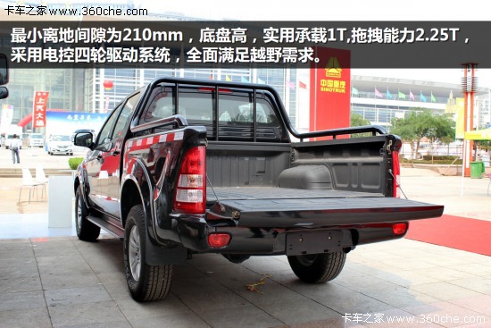 這款皮卡的最小離地間隙為210mm,高底盤,實用承載1T,拖拽能力2.25T,采用電控四輪驅(qū)動系統(tǒng),全面滿足越野需求。
