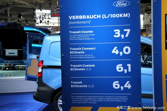 在此次漢諾威車展上,福特展出了旗下全順品牌系列的多款車型,其中涵蓋全順、全順CUSTOM、全順CONNECT、全順COURIER四個系列。其中配有發(fā)動機啟停技術(shù)的全順COURIER百公里3.7L油耗表現(xiàn)驚艷全場。
