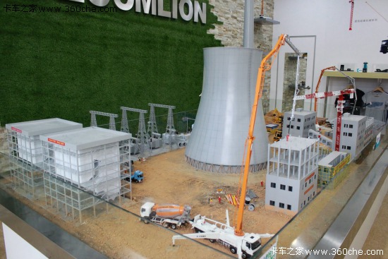 中聯(lián)中科的沙盤模型是一個正在建造中的發(fā)電站場景,其中包含了自己的混凝土攪拌車和泵車、汽車起重機、塔式起重機、挖掘機等產(chǎn)品。