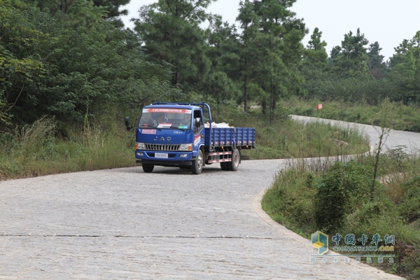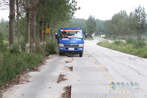 在這一路段,駿鈴搭載的有著“國際血統(tǒng)”的發(fā)動機果然不負(fù)所望,在車輛滿載的情況下,2擋即能輕松上坡。而據(jù)劉曉強介紹,動力性能表現(xiàn)不夠好的車輛,在這一坡道上必須換到1擋才能爬上去。