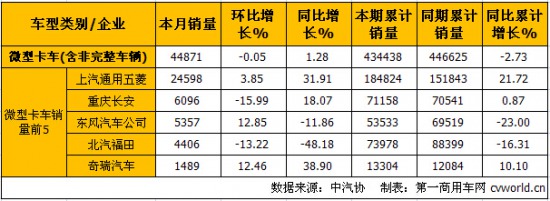10月份微型卡車(含非完整車輛)銷量前5的企業(yè)依次為:上汽通用五菱(24598輛)、重慶長安(6096輛)、東風(fēng)汽車公司(5357輛)、北汽福田(4406輛)和奇瑞汽車(1489輛),5家合計銷售41946輛,占微型卡車(含非完整車輛)總銷量44871輛的93.48%。