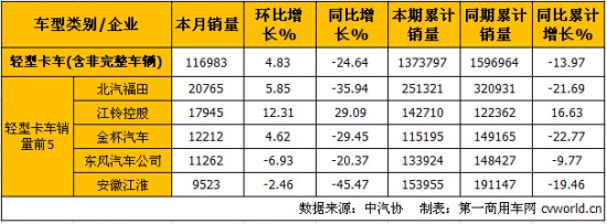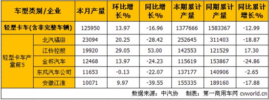 10月份輕型卡車(含非完整車輛)產(chǎn)量前5的企業(yè)依次為北汽福田(23094輛)、江鈴控股(19920輛)、金杯汽車(12468輛)、東風(fēng)汽車公司(11653輛)和安徽江淮(10071輛),5家合計生產(chǎn)77206輛,占輕型卡車(含非完整車輛)總產(chǎn)量125950輛的61.30%。