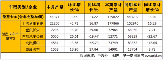 由上表可見,環(huán)比上月,10月份微卡產(chǎn)量前五企業(yè)有兩家實現(xiàn)正增長;與去年同期相比,則是三家企業(yè)正增長,兩家企業(yè)出現(xiàn)下滑。